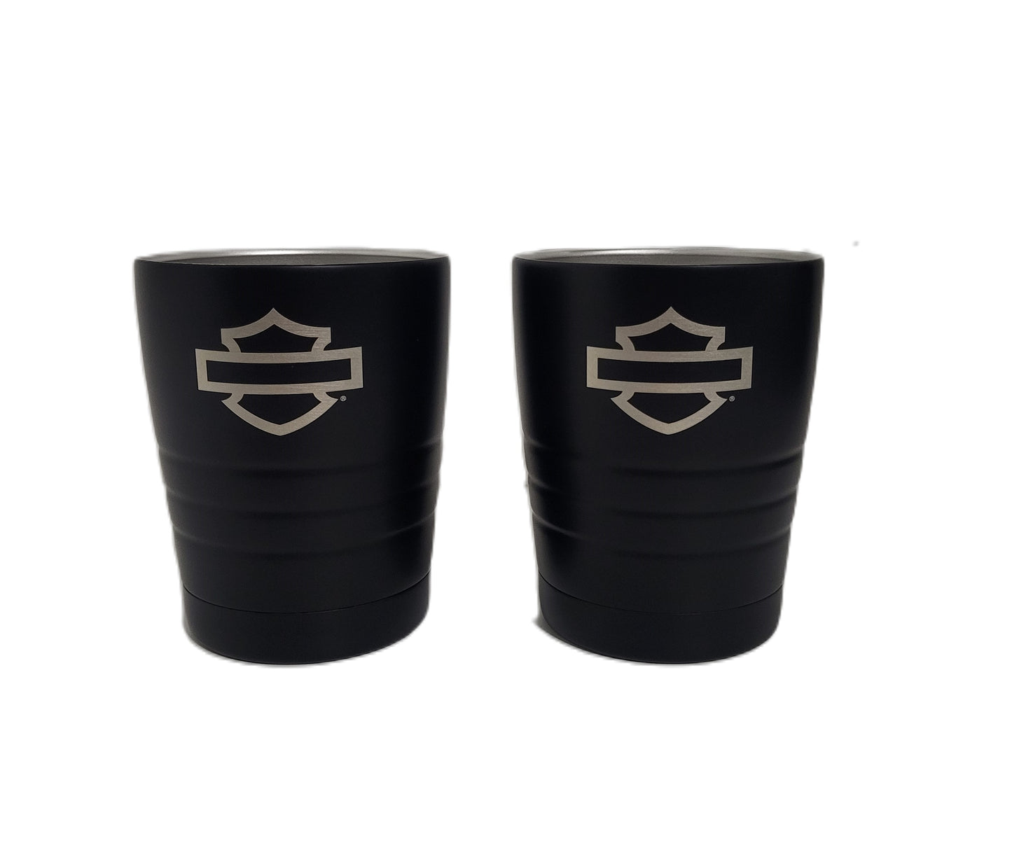 These Harley-Davidson® glasses feature a custom tooled profile and a laser etched Open Bar & Shield logo on a sleek matte black finish. Made of durable stainless steel and insulated for double-wall protection, these glasses hold 12 oz. / 360 ml and must be hand washed. Please do not microwave.
