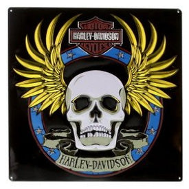 This embossed tin sign boasts a winged skull graphic in vibrant colors of black, gold, white and blue. Makes a loud H-D® statement for your man-cave, garage work-space or home bar. Measures 14.5"W x 14.5"H. Ande Rooney, Inc. Made in the USA.
