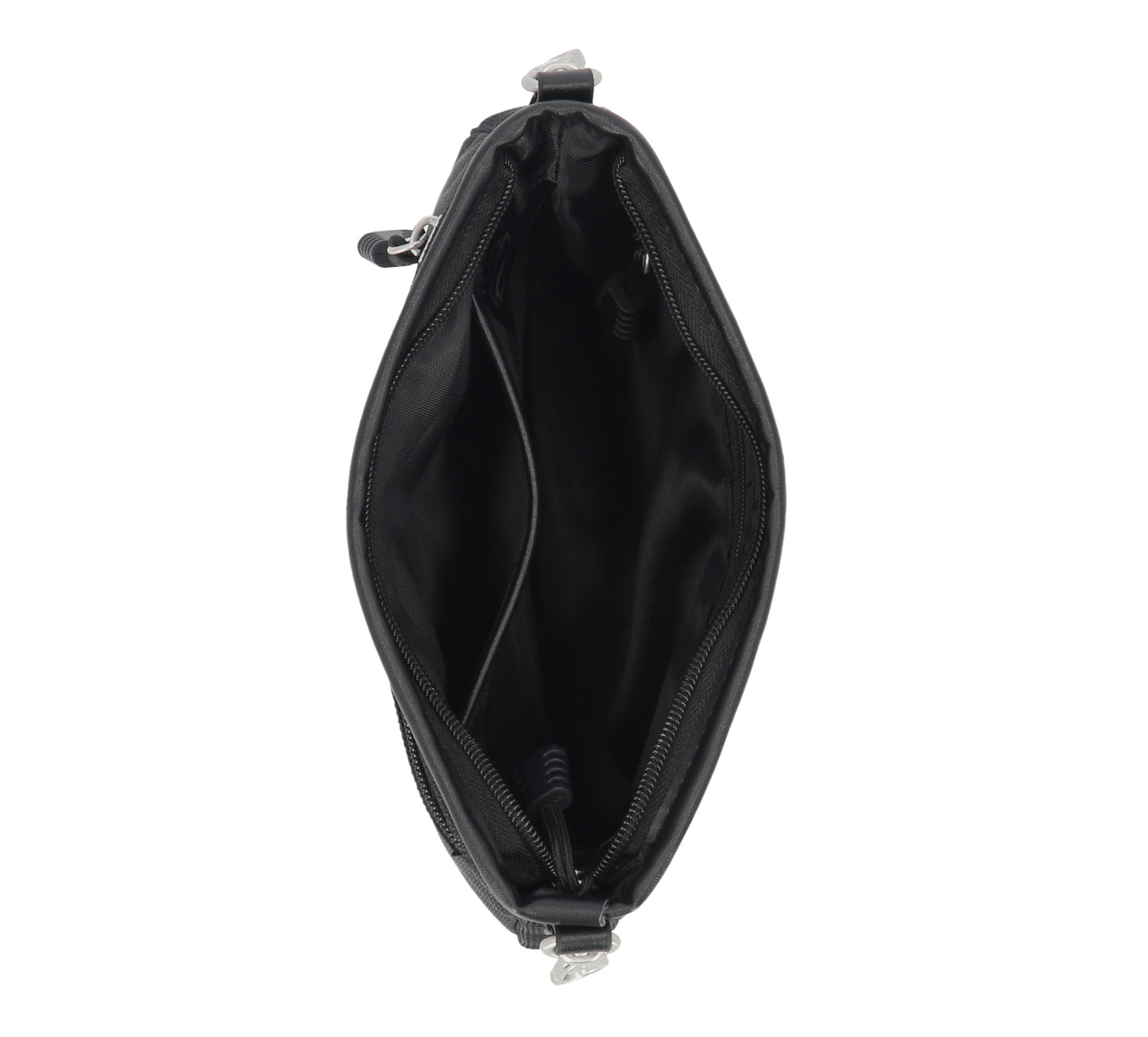 - Pockets include an exterior zipper pocket and an interior slip pocket