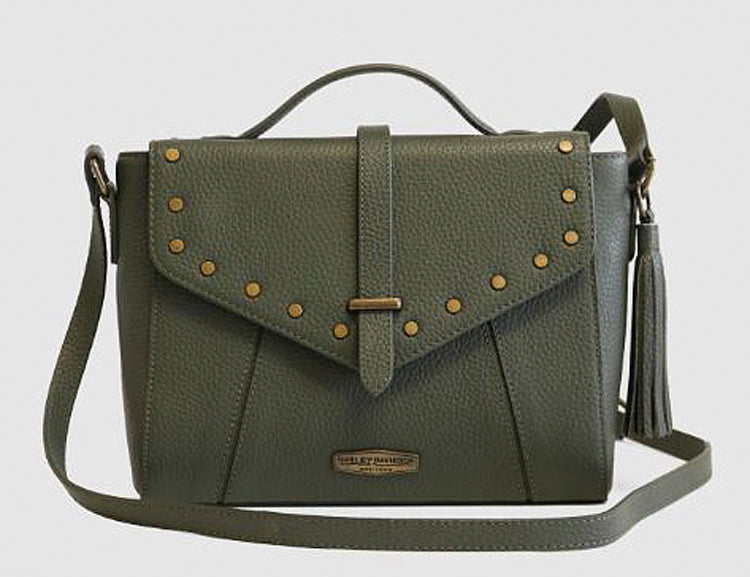 Blaze a new fashion trail when you carry the H-D® Midnight Rider Shoulder Bag in season-fresh Olive Green. Made from green-milled/tumbled leather for a delightfully soft touch, this handbag displays a pebbled surface for a rich textured look that stands up to your active lifestyle. Design details include an adjustable handle that extends for a crossbody fit, a whimsical leather tassel, a magnetic closure on the flap closure, a top-zipper, a back zip pocket and an interior zip pocket. The pieced leather design, accented with shape-defining antique brass flat-head rivets and an antique brass Harley-Davidson® nameplate presents a sophisticated look that complements office attire or your best riding gear, because it conveys confidence. Count on it. Measures approximately 9.75"W x 7.75"H x 3.75"D. Olive Green. Leather. Leather Accessory Source