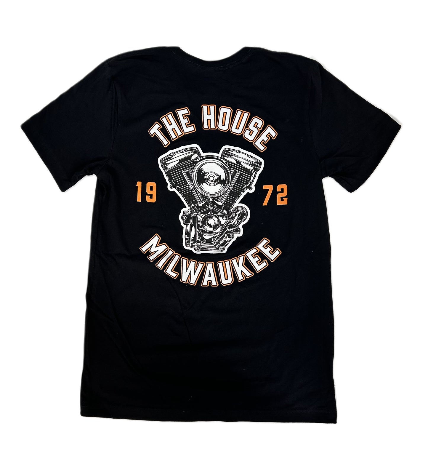 - Printed graphics on this black T-Shirt display our brand, The House Milwaukee on the front; while on the back The House Milwaukee 1972 logo is featured with the infamous "Knucklehead" Engine