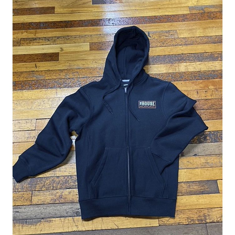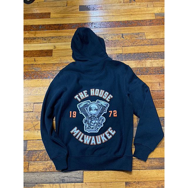 - The custom print graphics on the front of this black hoodie display our unique THE HOUSE / MILWAUKEE logo design; while on the back our story continues with an over-sized V-Twin® engine illustration framed by THE HOUSE (above) and MILWAUKEE (below), and a reference to 1972 when the House of Harley-Davidson® first opened its doors -- 50 years ago!