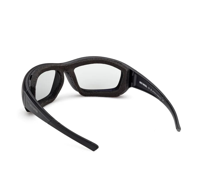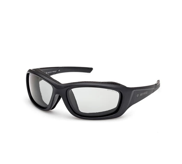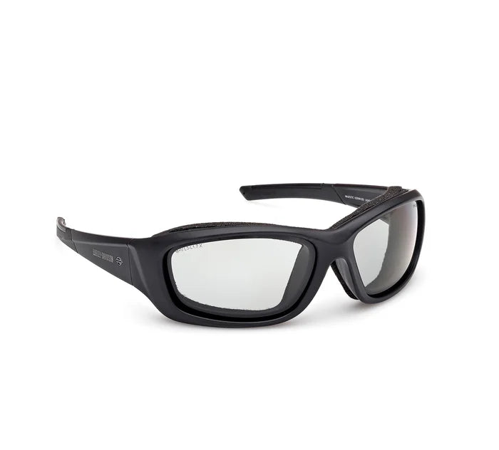 Unisex sport wrap with bar and shield plaque and Harley Davidson logo. ANSI-rated for on-the-bike use. Removable Gasket. 8-Base. Fits head sizes Medium to Large. Replacement Gasket sold separately. Perfect for all-weather cycling, the photochromic lens automatically adjusts to any changes in UV light — from bright sun to heavy cloud cover. Its anti-glare properties increase road visibility.