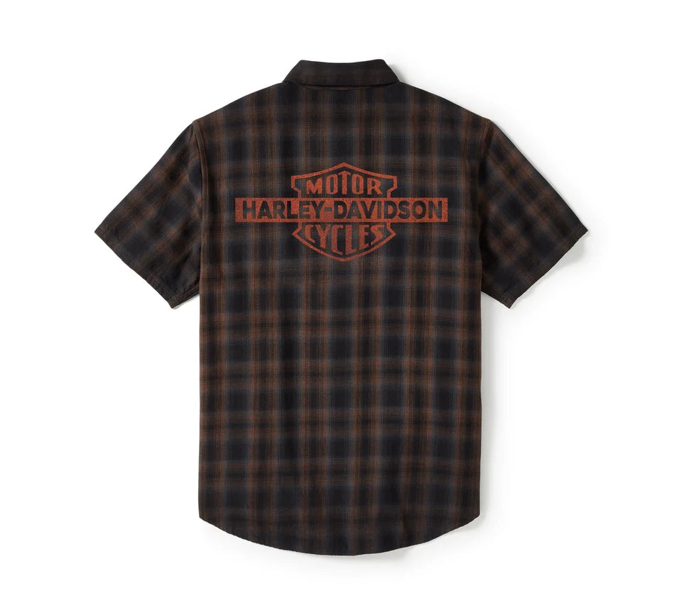 Classic moto style is here on our Bar & Shield Plaid Short Sleeve Shirt. Made for breathable comfort from all-cotton poplin that’s vintage washed for a well-worn vibe. This men’s button down features a pen stall and a hidden snap-down collar that stays put under riding gear. Finished with a replica of our 1930s Bar & Shield patched on front and printed on back.