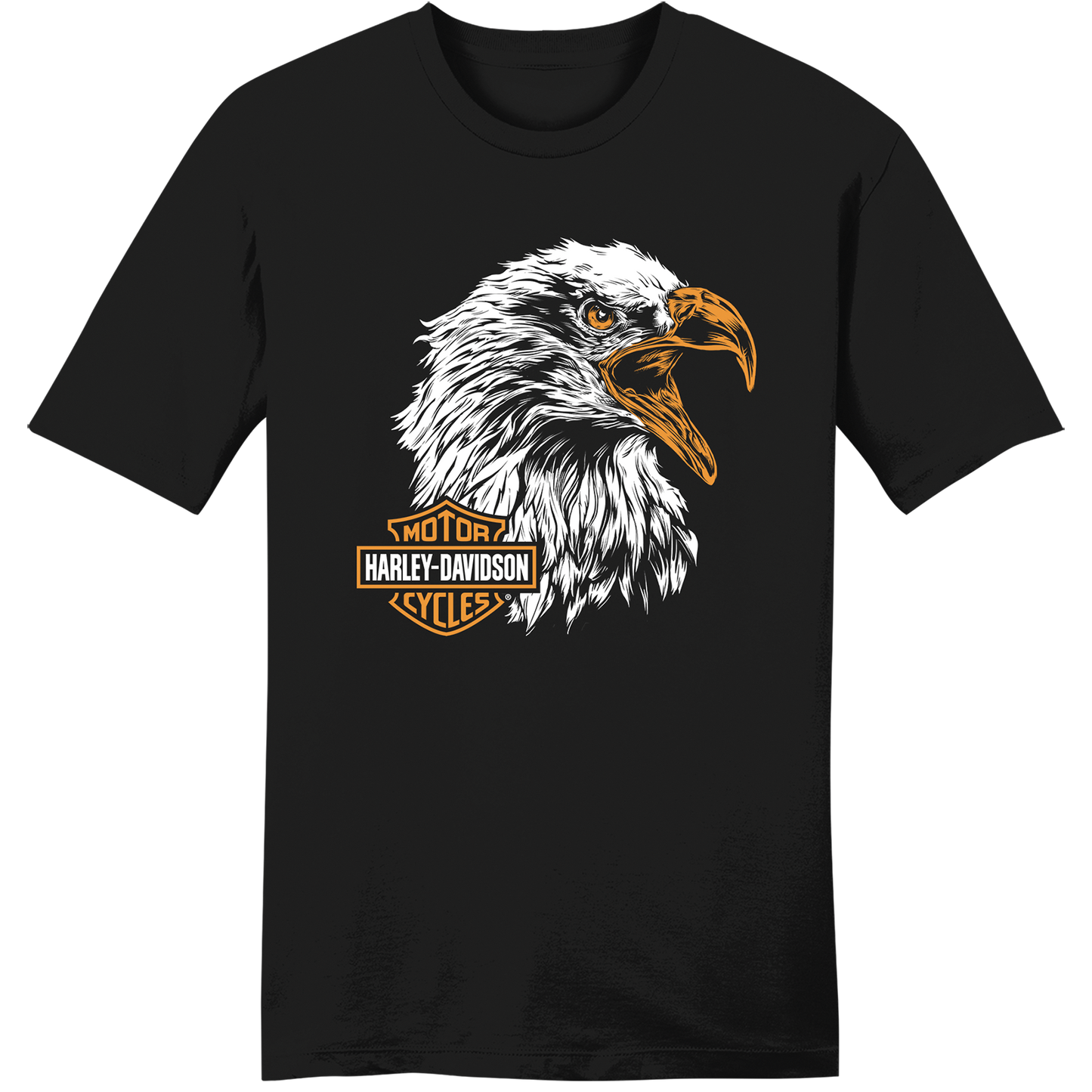- The printed graphics on the front of this black short-sleeved Tee feature an American Bald Eagle and the iconic Bar & Shield® Bar & Shield logo; the custom graphics on the back include the House of Harley-Davidson® script along with #1 Racing logo, and the Milwaukee, WI locator