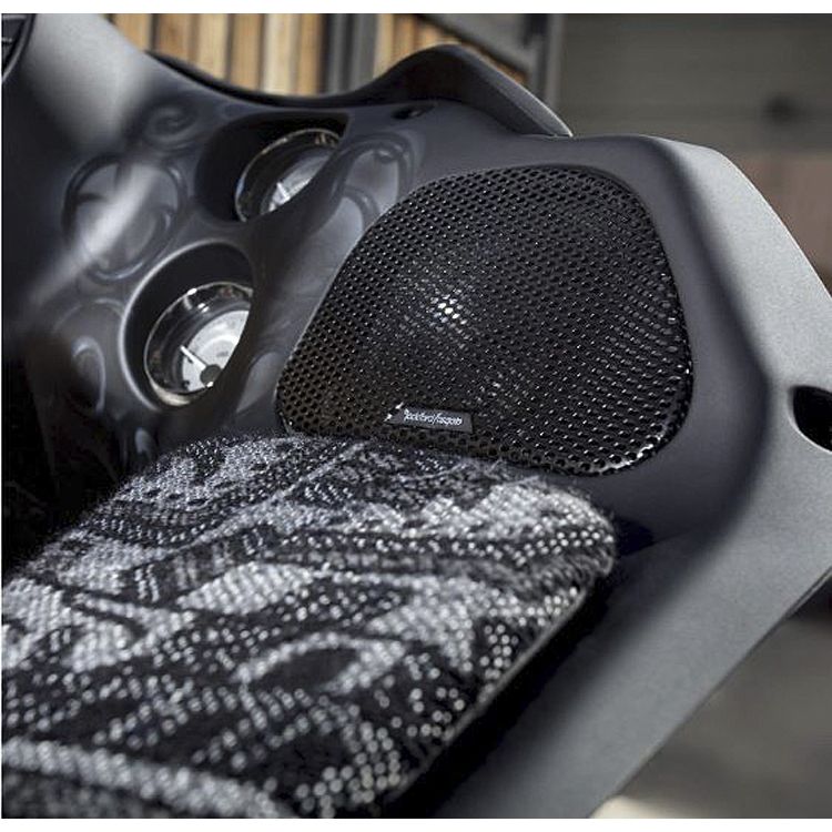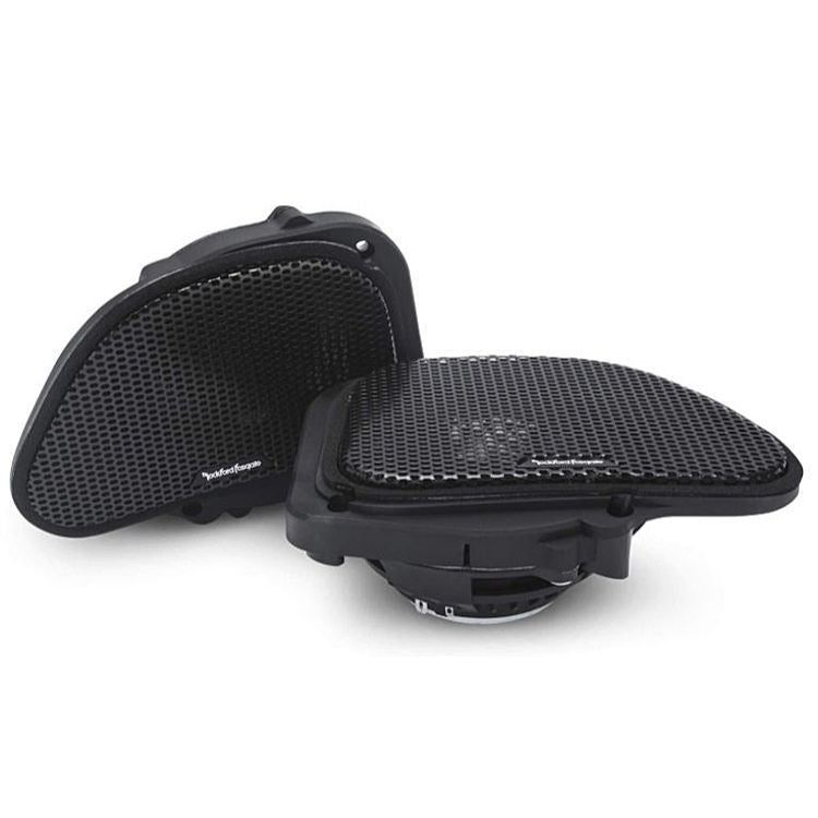 The Rockford Fosgate® TMS6RG full-range coaxial speaker is designed to fit the fairing speaker location for select 1998-2013 Harley-Davidson® Road Glide® motorcycles. It features a Neodymium motor structure driving a co-molded, reinforced polypropylene cone with Santoprene surround -- ensuring maximum frequency response & output in both the mid- and low-frequency range. It also features an ultra-efficient 25mm dome tweeter with integrated phase plug for crisp, clear highs even at highway cruising speeds, and is made water/weather resistant with the addition of a Santoprene front isolation spider connecting between the tweeter housing and cone assembly. The speaker directly replaces the existing factory speakers using the factory mounting hardware and speaker connections, while providing new grille assemblies. Midrange size (Nominal Diameter) measuring approximately 6.5". Glass-reinforced polymer frame. Purpose Built Audio. Rockford Fosgate®